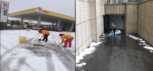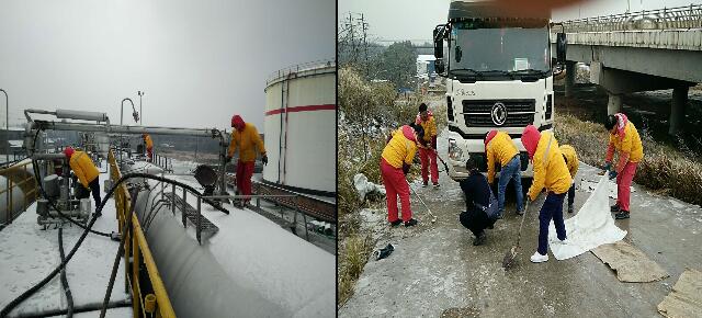 寒风中,油库一线员工为维护正常卸、发油而冒雪工作,检查设施设备状态;物流车队司机们风雪无阻,排除困难,按时按点将油品安全送达客户、送到各站点;各个加油站基层员工通力合作,扫除油站积雪,保障油站进出通道顺畅通行和行车安全;总部行政、物业人员也及时给办公楼前坪进行扫雪、除冰,为行政办公工作保驾护航。
